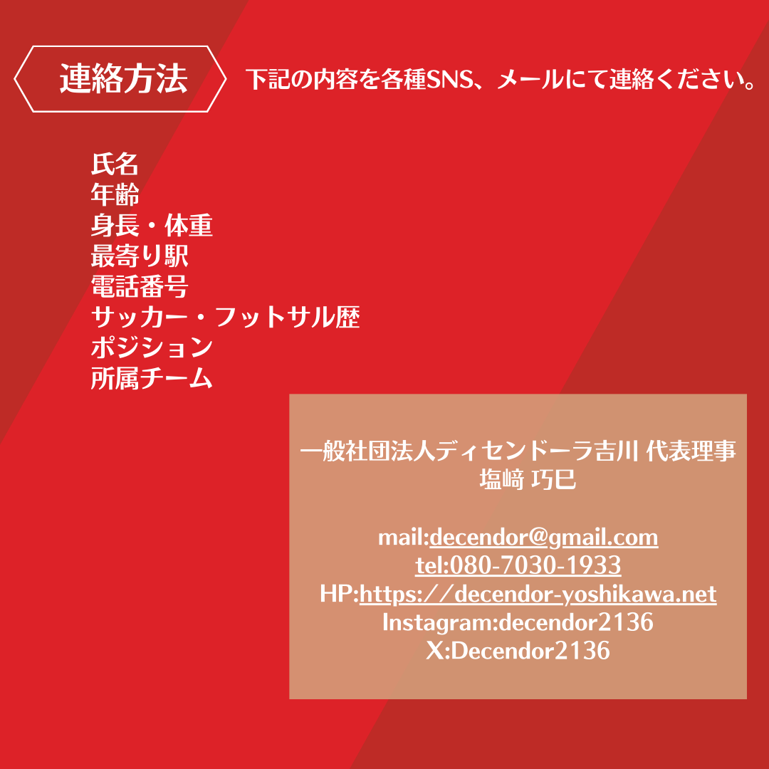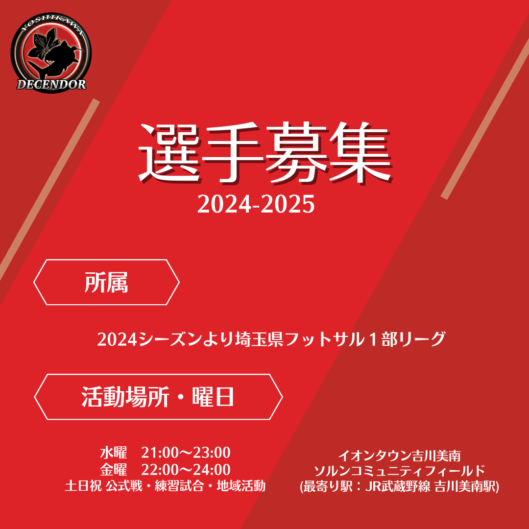 ディセンドーラ吉川は、2023シーズン、埼玉県フットサル2部リーグを優勝し、1部昇格を決めました。クラブとしては3年目を終え、まだまだ日の浅いクラブですが、MISSIONである「スポーツに新たな価値を。人々に新たな文化を」を掲げ、クラブを通じたコミュニティ形成・人材育成、キッカケづくりを軸に活動しております。ピッチ内外でクラブの活動を体現でき、仕事・競技を全力で取り組める選手のみを募集しています。志を持った選手に関してはクラブとして全力でサポートさせていただきます。新たな出会いを楽しみにしています。