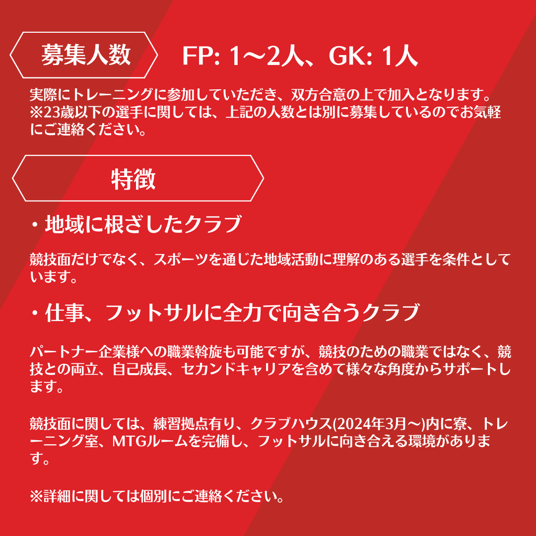 16歳以上の男性(高校生可)を対象とし、クラブの定める活動(競技・地域活動)に週1回以上参加できる選手に限ります。